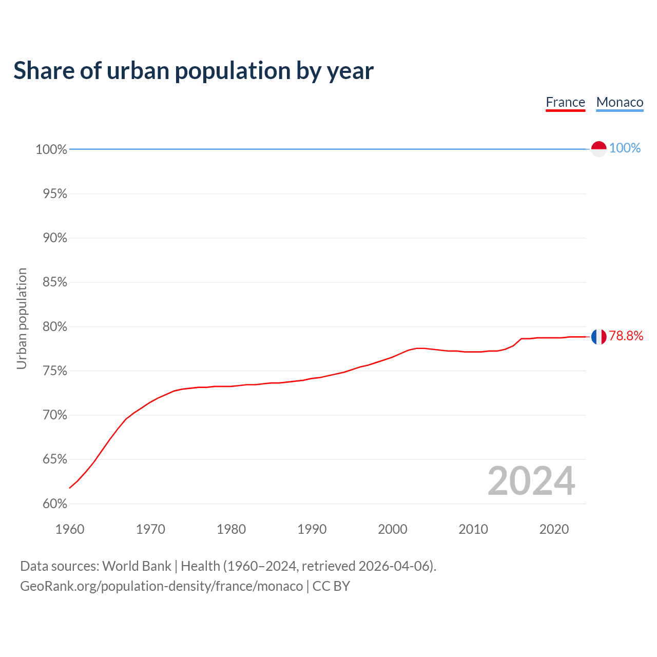From 2004 to 2024, the share of urban population changed from 77.5% to 78.8% in France and from 100% to 100% in Monaco.
