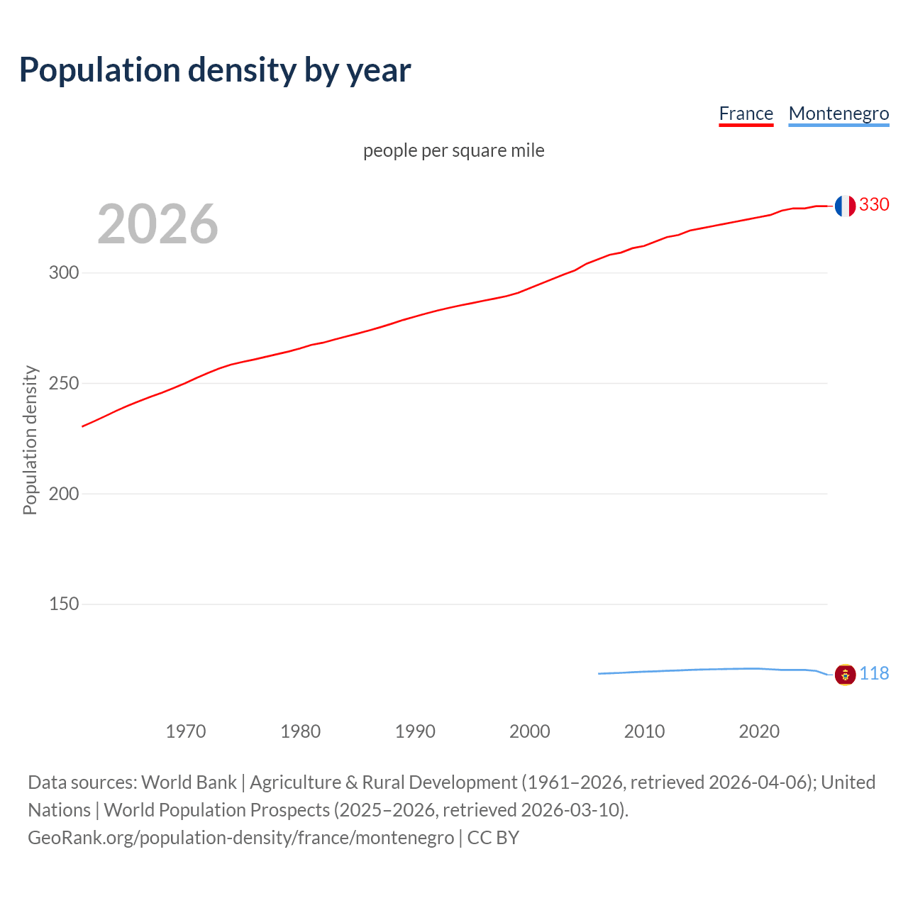 From 2006 to 2026, population density in France increased by 8.08%, compared to a 0.44% decline in Montenegro.