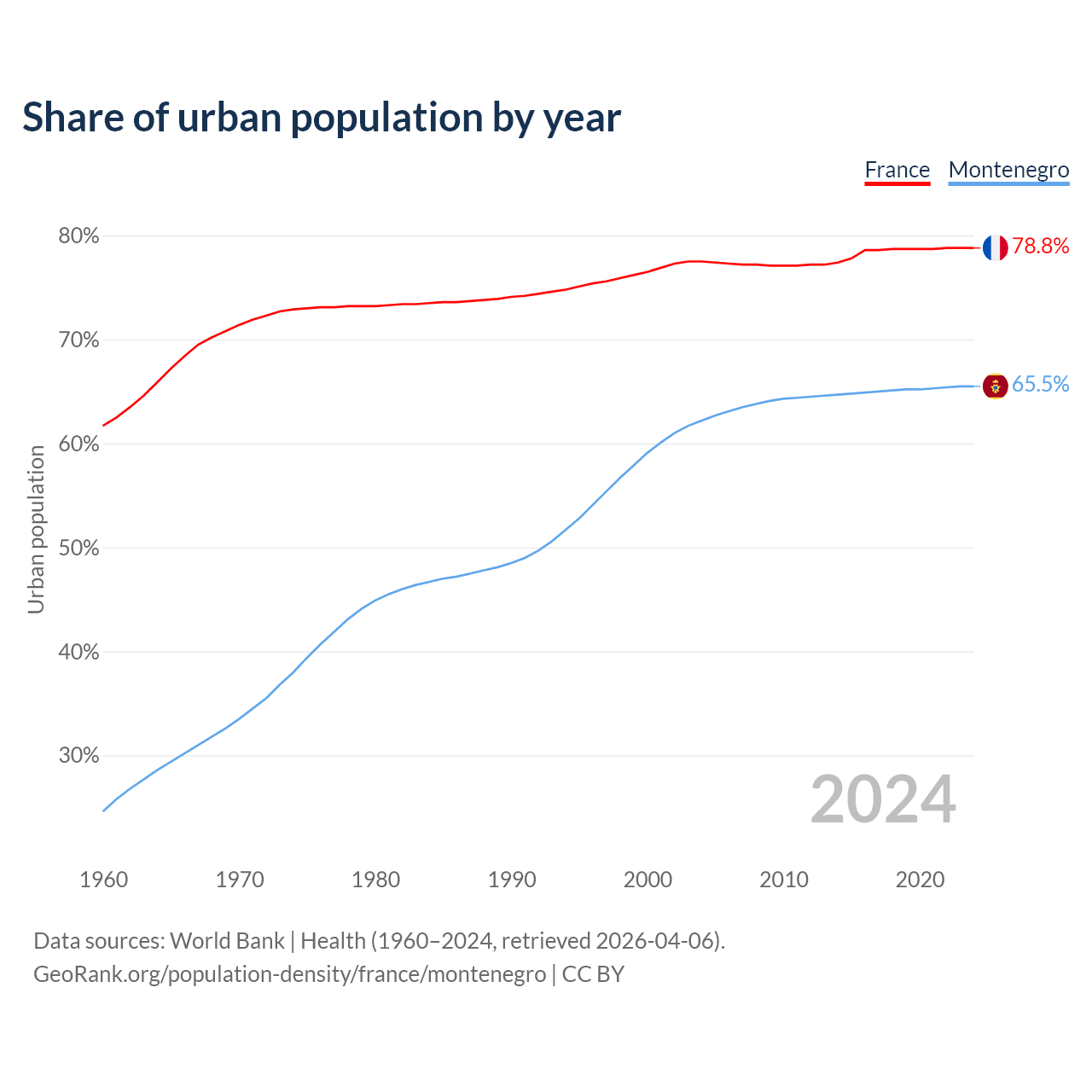 From 2004 to 2024, the share of urban population changed from 77.5% to 78.8% in France and from 62.2% to 65.5% in Montenegro.