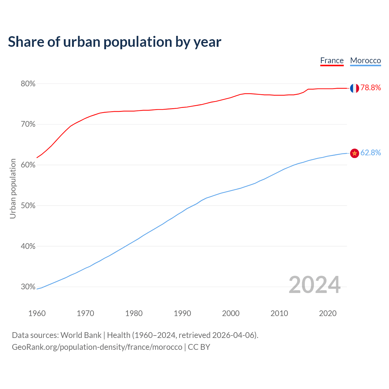 From 2004 to 2024, the share of urban population changed from 77.5% to 78.8% in France and from 55% to 62.8% in Morocco.