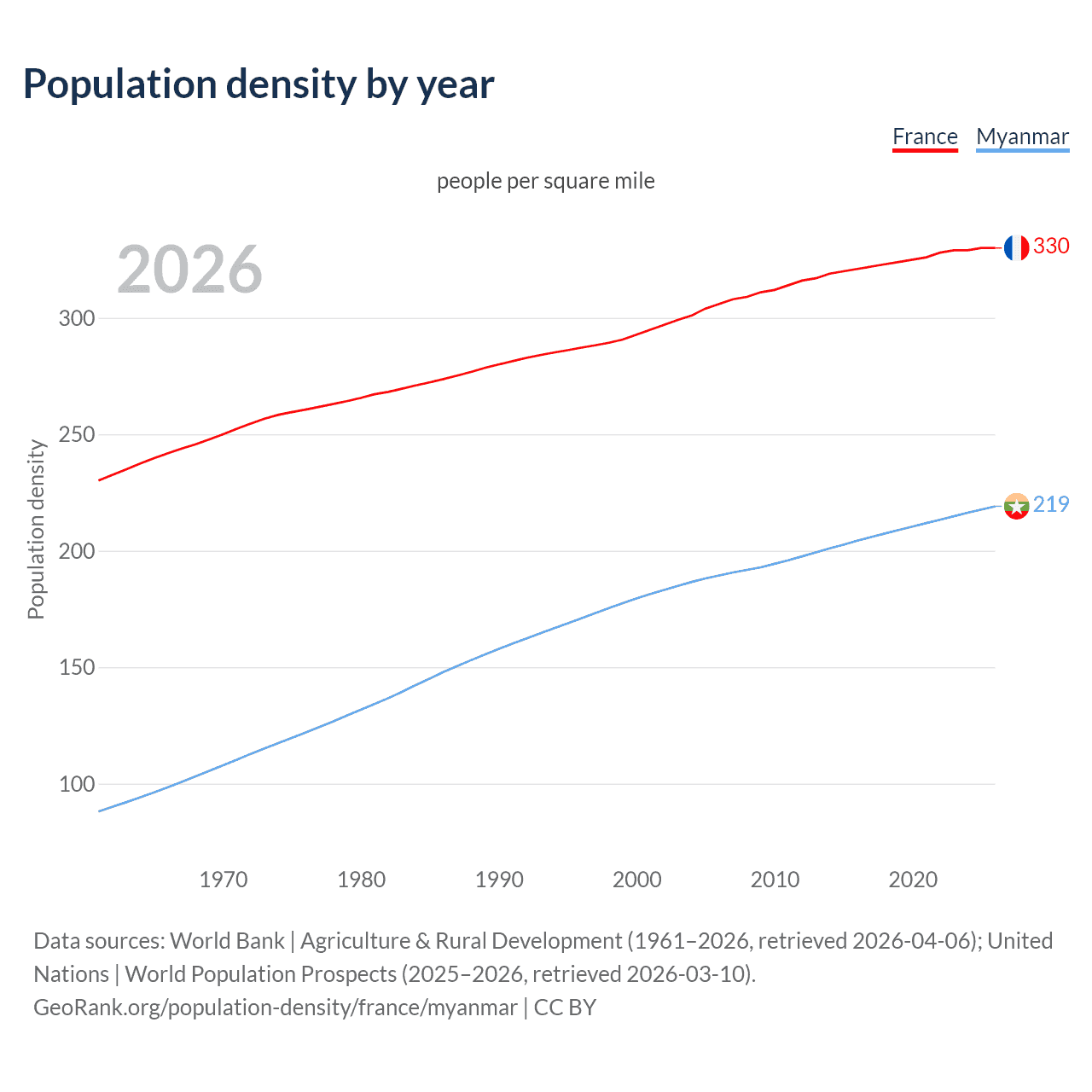 France has a population density of 330 people per square mile compared to 219.1 people in Myanmar. France has 101,089 sq ft of land per person vs 133,626 sq ft in Myanmar. France and Myanmar rank 75th and 105th by population density, respectively.