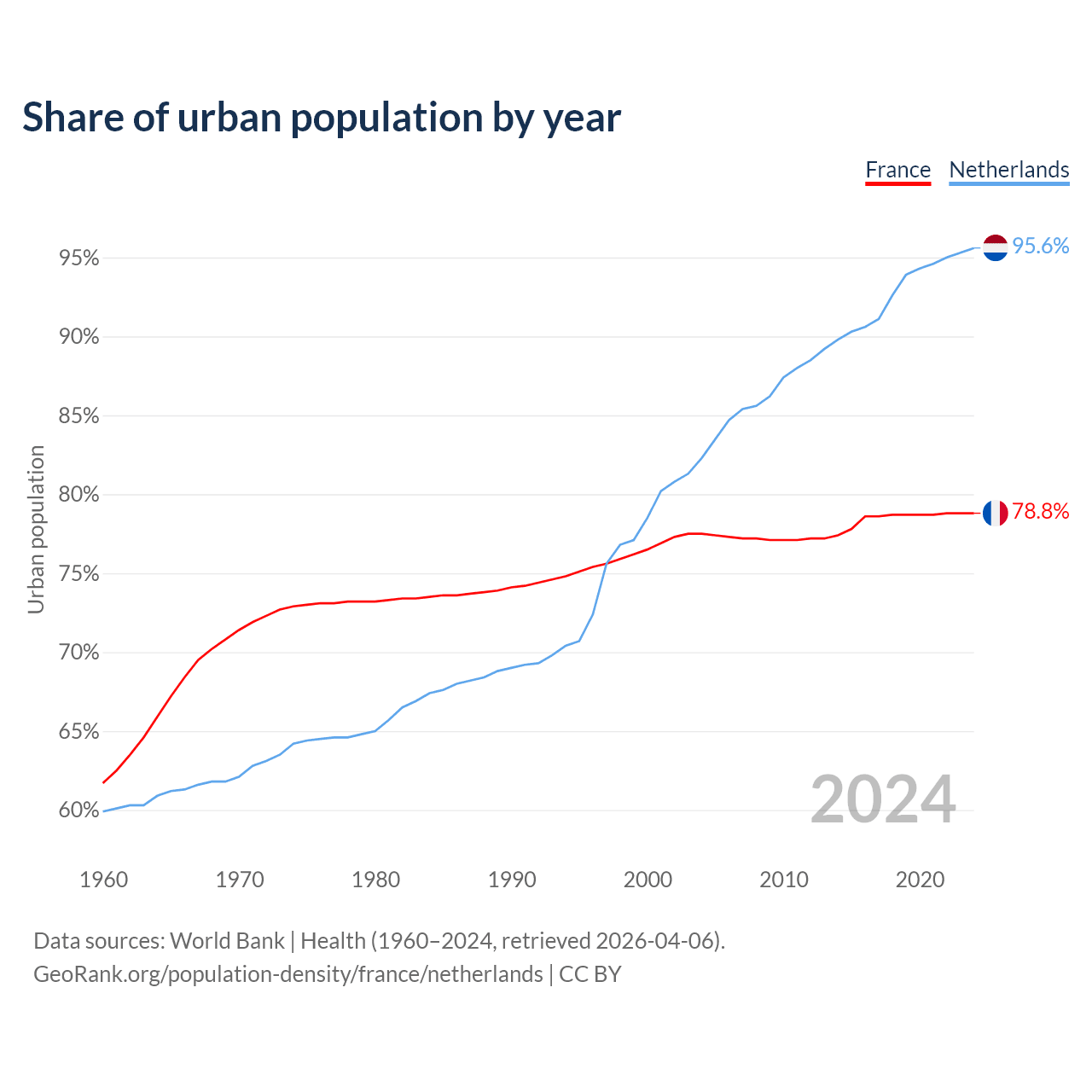 From 2004 to 2024, the share of urban population changed from 77.5% to 78.8% in France and from 82.3% to 95.6% in the Netherlands.