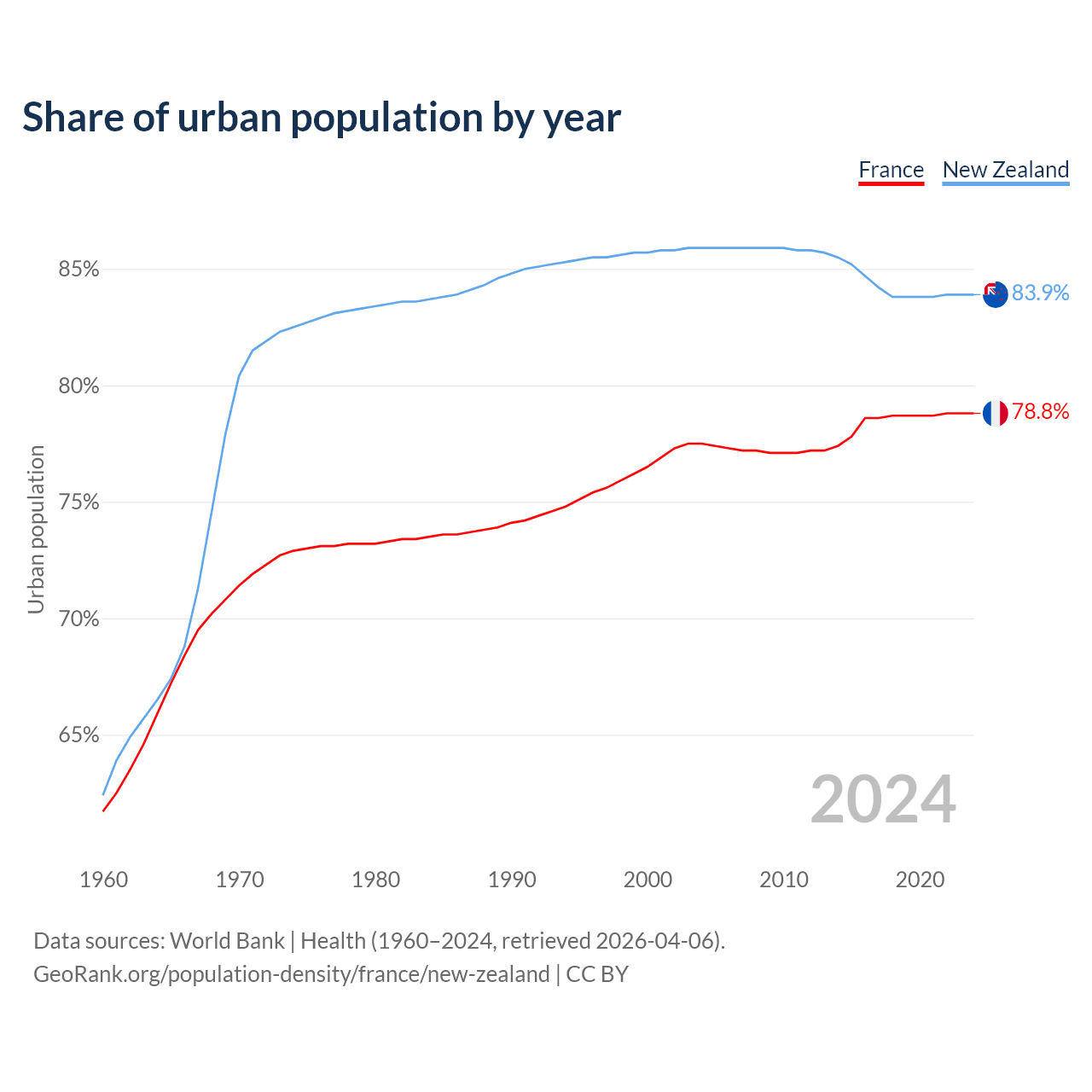 From 2004 to 2024, the share of urban population changed from 77.5% to 78.8% in France and from 85.9% to 83.9% in New Zealand.