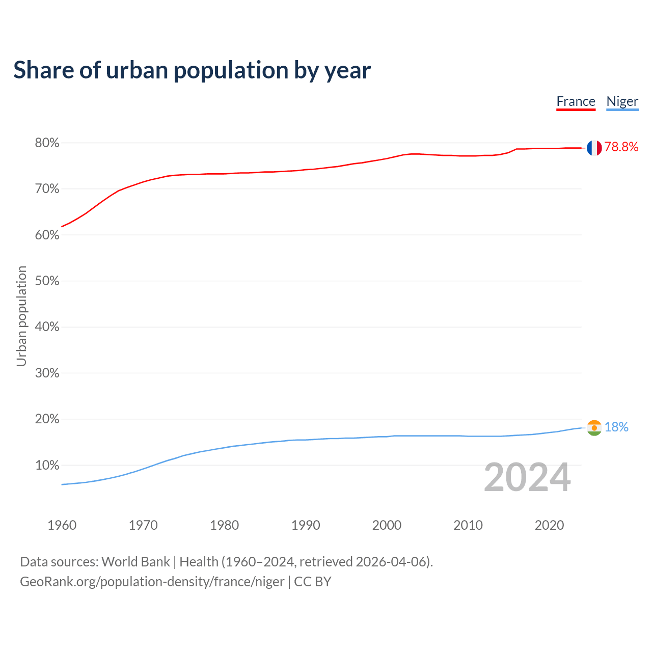 From 2004 to 2024, the share of urban population changed from 77.5% to 78.8% in France and from 16.3% to 18% in Niger.