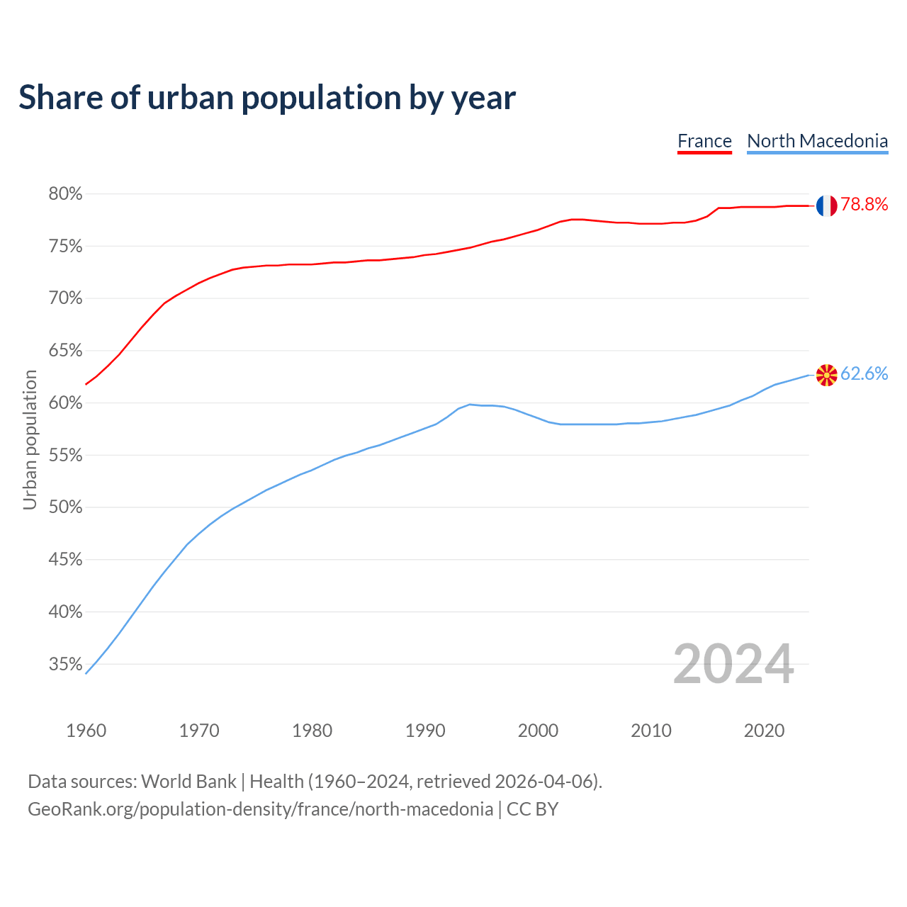 From 2004 to 2024, the share of urban population changed from 77.5% to 78.8% in France and from 57.9% to 62.6% in North Macedonia.