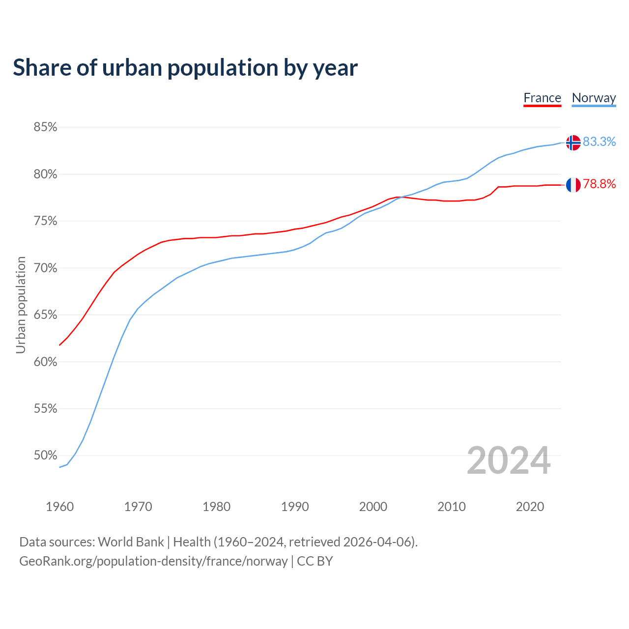 From 2004 to 2024, the share of urban population changed from 77.5% to 78.8% in France and from 77.6% to 83.3% in Norway.