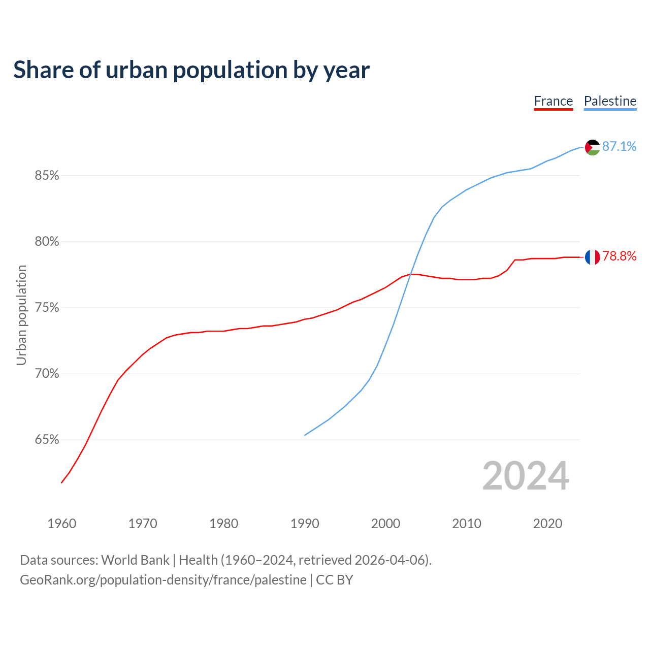 From 2004 to 2024, the share of urban population changed from 77.5% to 78.8% in France and from 79% to 87.1% in Palestine.