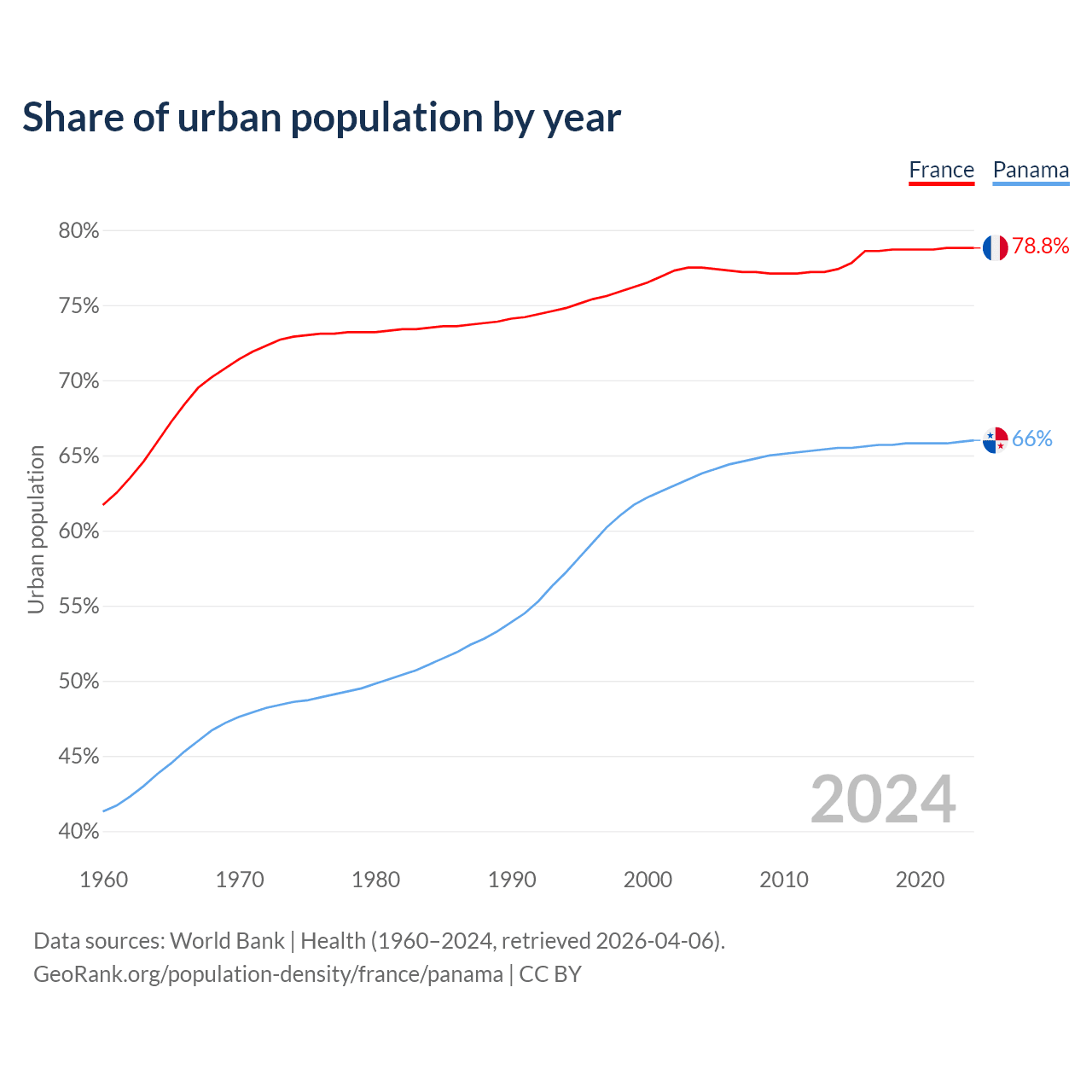 From 2004 to 2024, the share of urban population changed from 77.5% to 78.8% in France and from 63.8% to 66% in Panama.