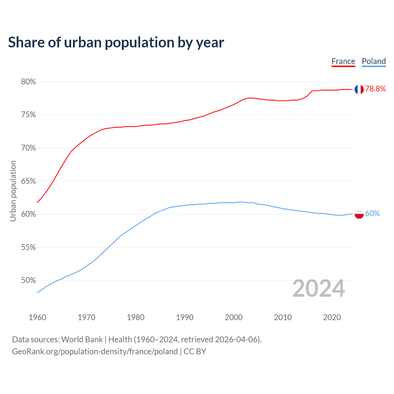 From 2004 to 2024, the share of urban population changed from 77.5% to 78.8% in France and from 61.7% to 60% in Poland.