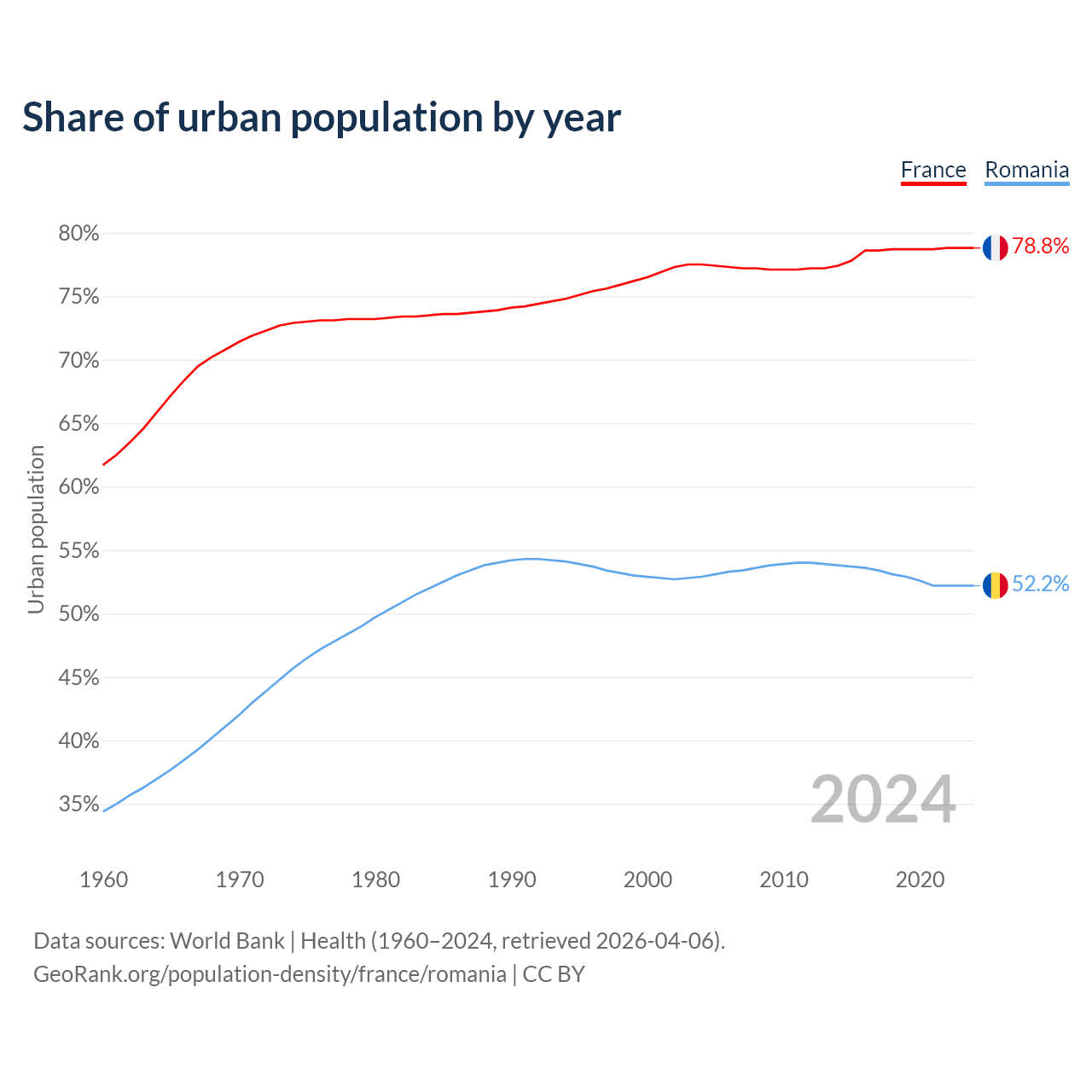 From 2004 to 2024, the share of urban population changed from 77.5% to 78.8% in France and from 52.9% to 52.2% in Romania.