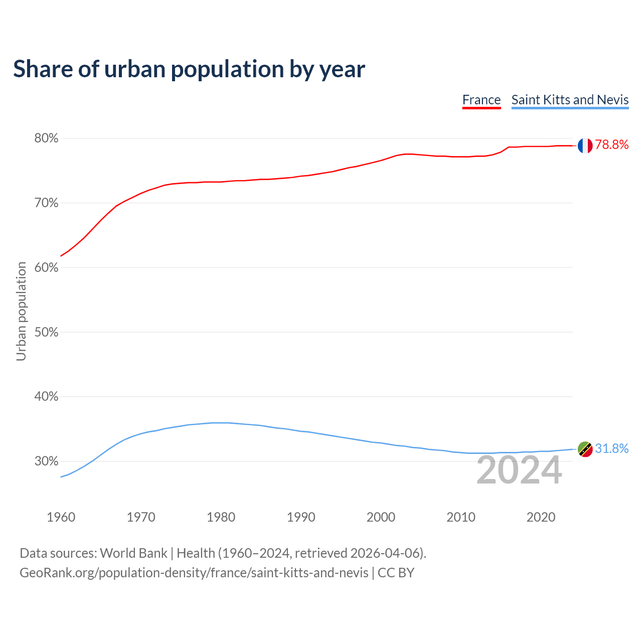 From 2004 to 2024, the share of urban population changed from 77.5% to 78.8% in France and from 32.1% to 31.8% in Saint Kitts and Nevis.