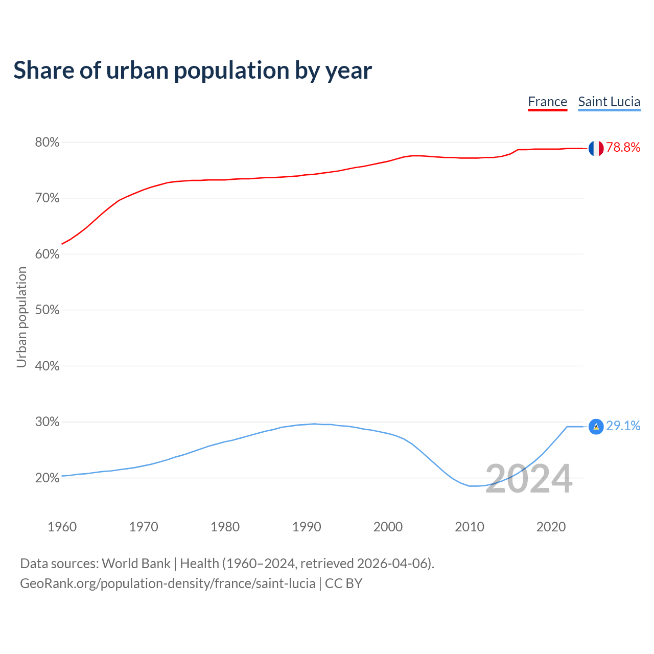 From 2004 to 2024, the share of urban population changed from 77.5% to 78.8% in France and from 24.8% to 29.1% in Saint Lucia.