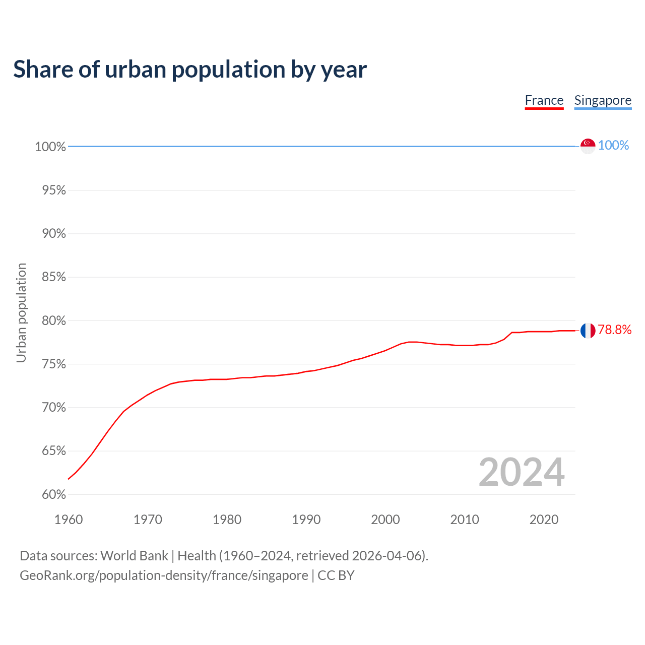 From 2004 to 2024, the share of urban population changed from 77.5% to 78.8% in France and from 100% to 100% in Singapore.