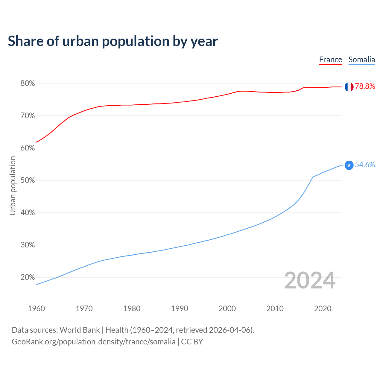 From 2004 to 2024, the share of urban population changed from 77.5% to 78.8% in France and from 35% to 54.6% in Somalia.