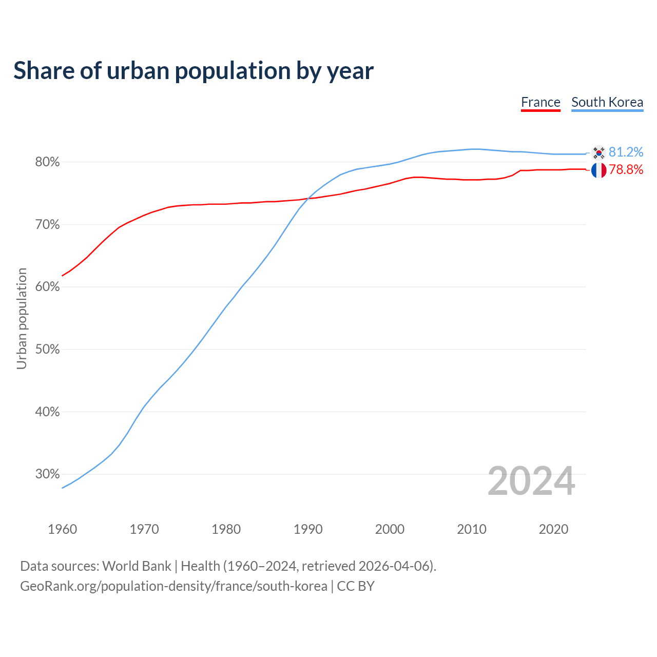 From 2004 to 2024, the share of urban population changed from 77.5% to 78.8% in France and from 81.1% to 81.2% in South Korea.