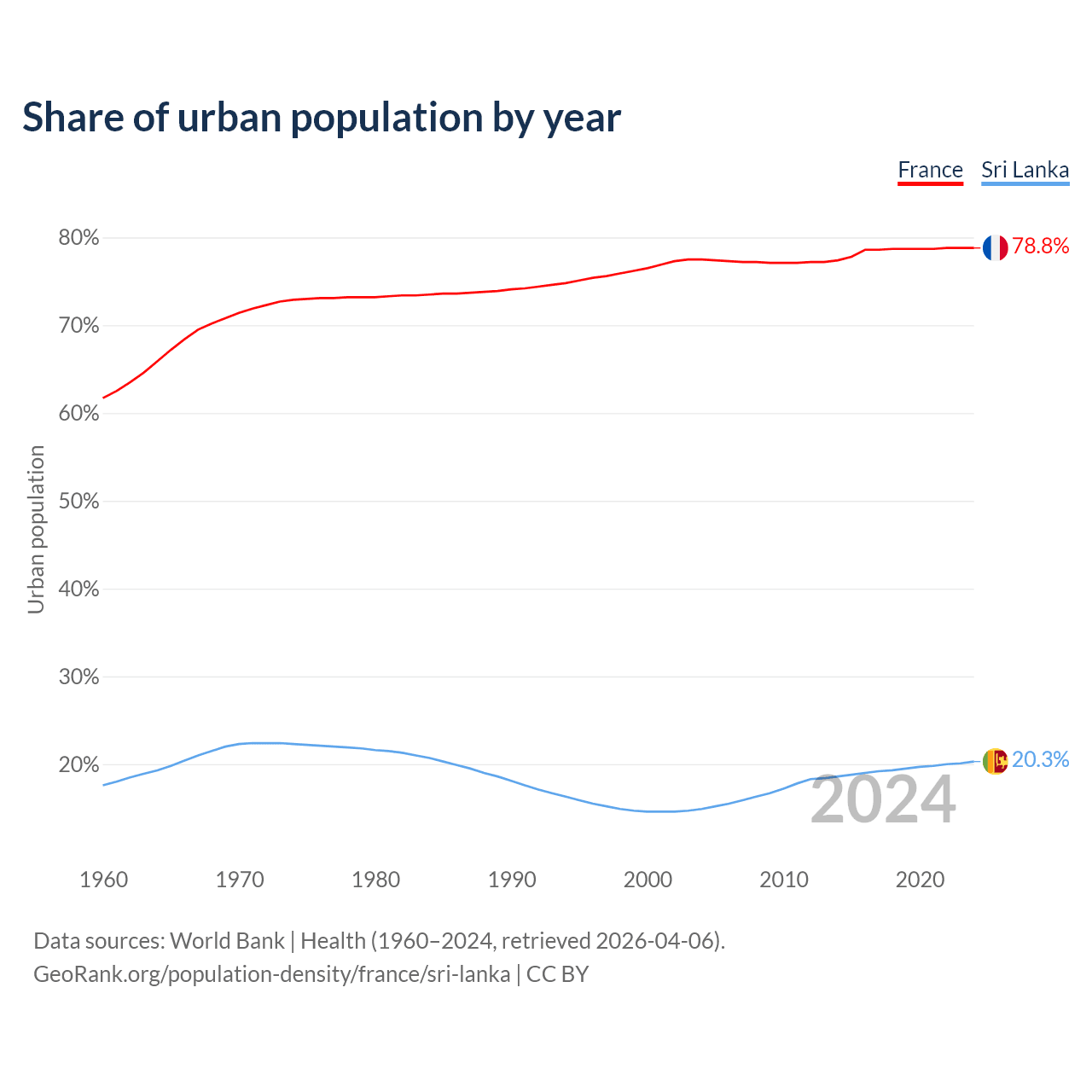 From 2004 to 2024, the share of urban population changed from 77.5% to 78.8% in France and from 14.9% to 20.3% in Sri Lanka.