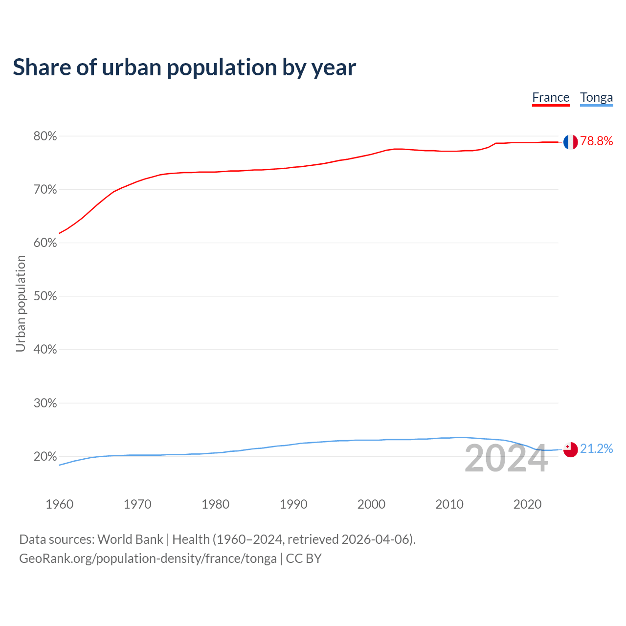 From 2004 to 2024, the share of urban population changed from 77.5% to 78.8% in France and from 23.1% to 21.2% in Tonga.