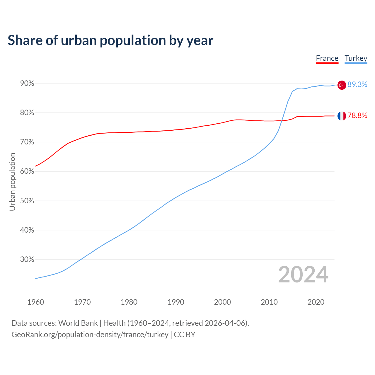 From 2004 to 2024, the share of urban population changed from 77.5% to 78.8% in France and from 62.4% to 89.3% in Turkey.