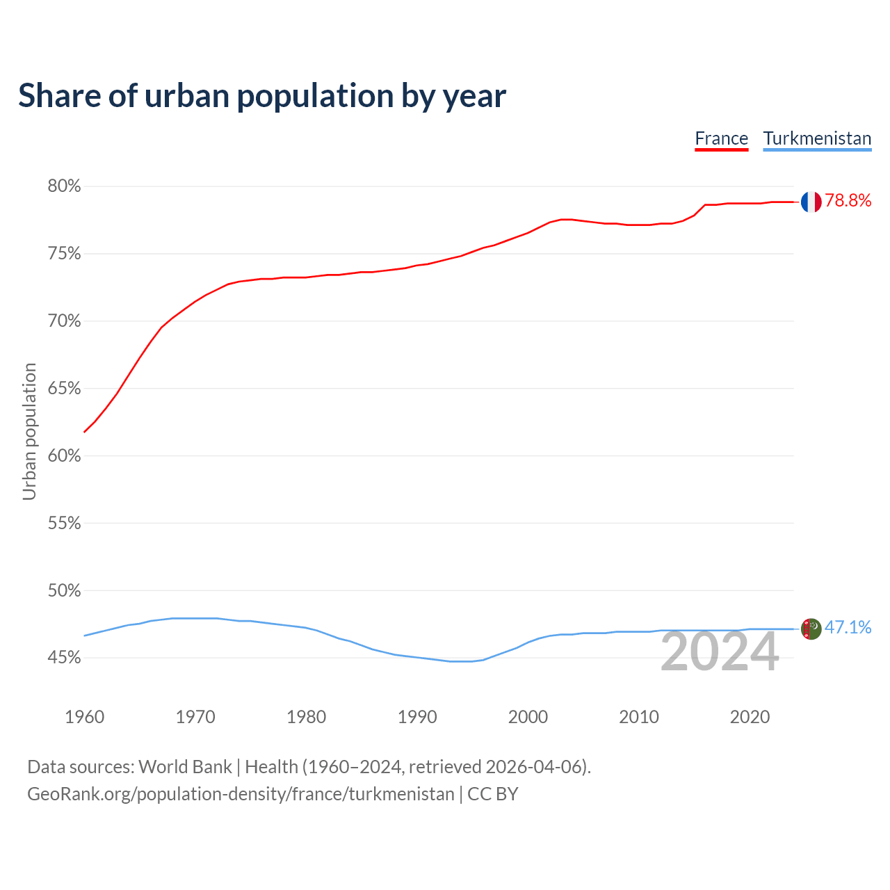 From 2004 to 2024, the share of urban population changed from 77.5% to 78.8% in France and from 46.7% to 47.1% in Turkmenistan.