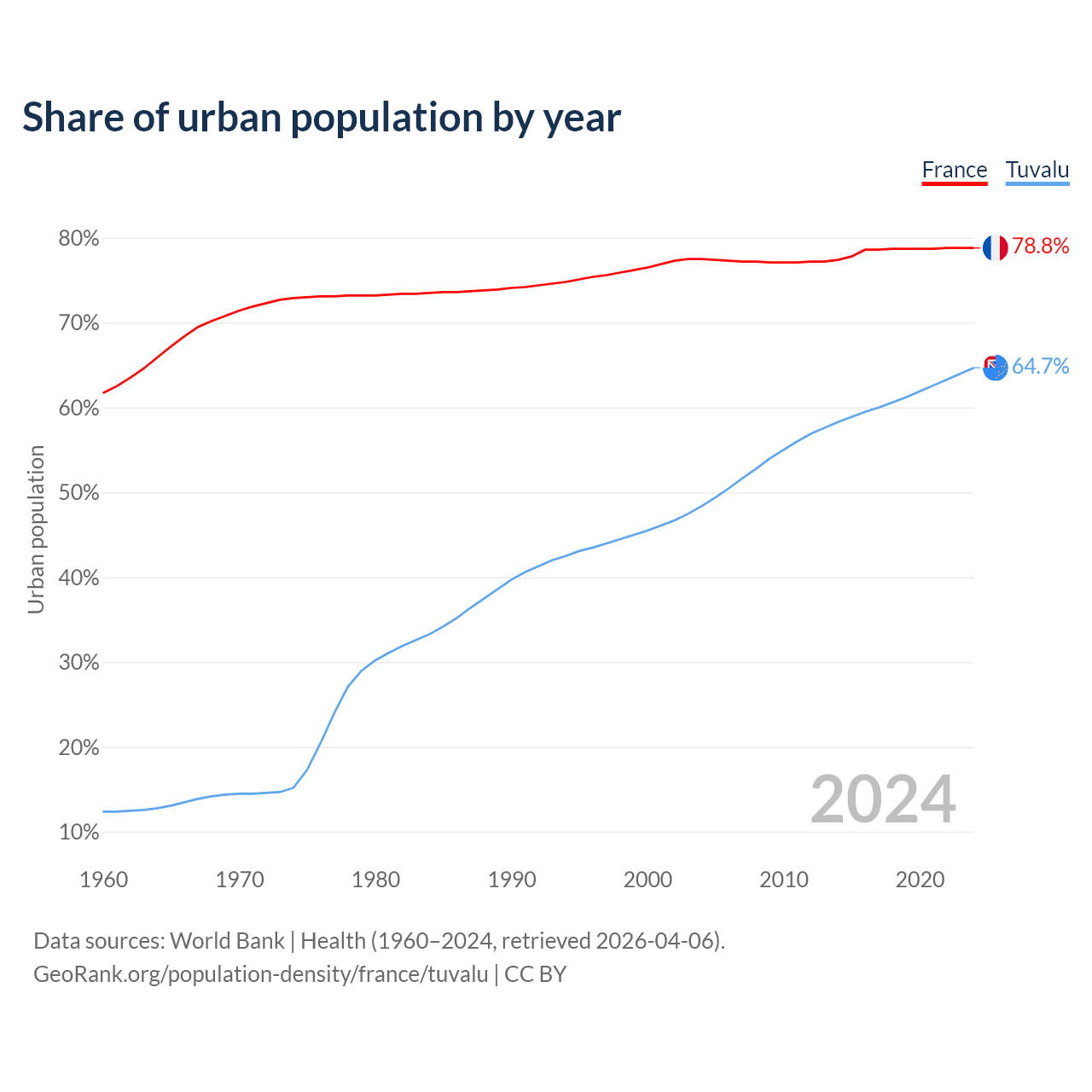 From 2004 to 2024, the share of urban population changed from 77.5% to 78.8% in France and from 48.4% to 64.7% in Tuvalu.