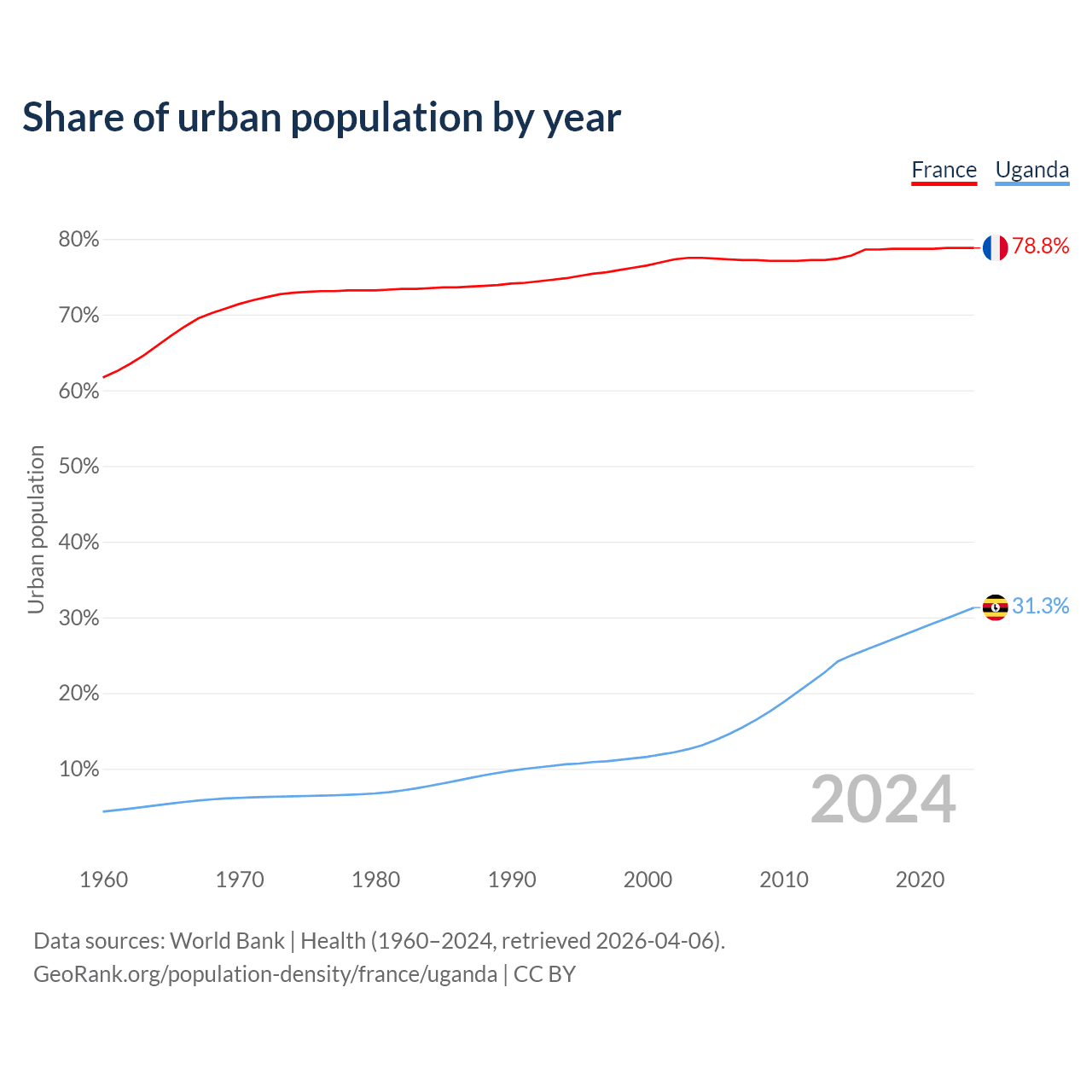 From 2004 to 2024, the share of urban population changed from 77.5% to 78.8% in France and from 13.1% to 31.3% in Uganda.