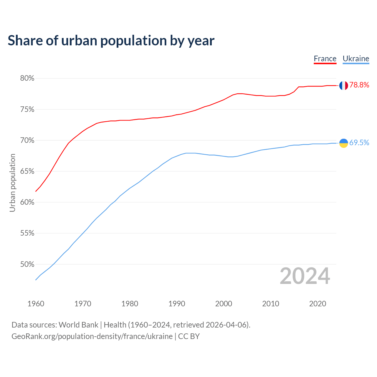 From 2004 to 2024, the share of urban population changed from 77.5% to 78.8% in France and from 67.6% to 69.5% in Ukraine.