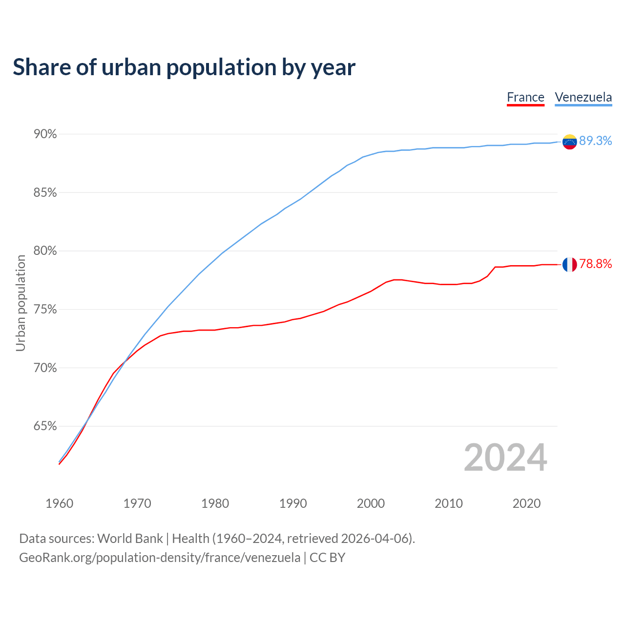 From 2004 to 2024, the share of urban population changed from 77.5% to 78.8% in France and from 88.6% to 89.3% in Venezuela.