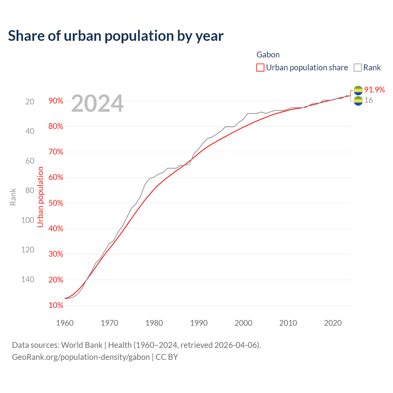 This chart shows the share of urban population in Gabon from 1960 to 2024: 12.6% lived in urban areas in 1960, 79.6% in 2000, and 91.9% in 2024.