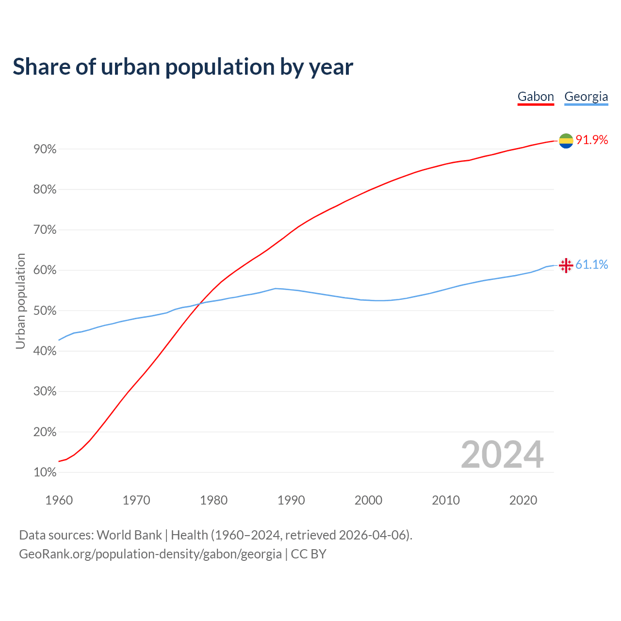 From 2004 to 2024, the share of urban population changed from 82.7% to 91.9% in Gabon and from 52.7% to 61.1% in Georgia.