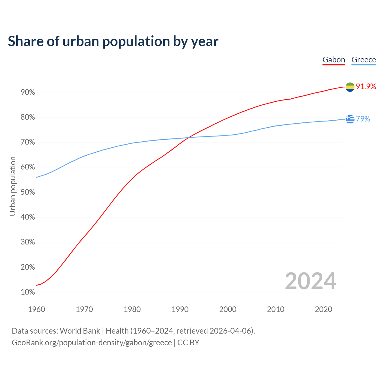 From 2004 to 2024, the share of urban population changed from 82.7% to 91.9% in Gabon and from 73.8% to 79% in Greece.