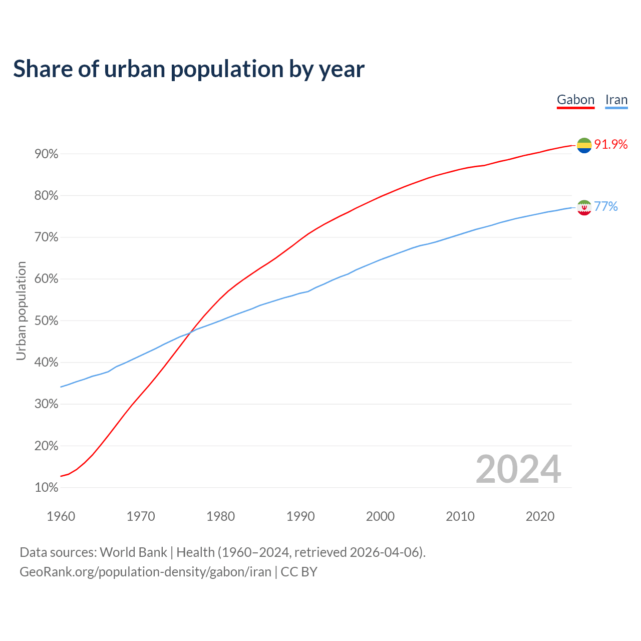 From 2004 to 2024, the share of urban population changed from 82.7% to 91.9% in Gabon and from 67.3% to 77% in Iran.