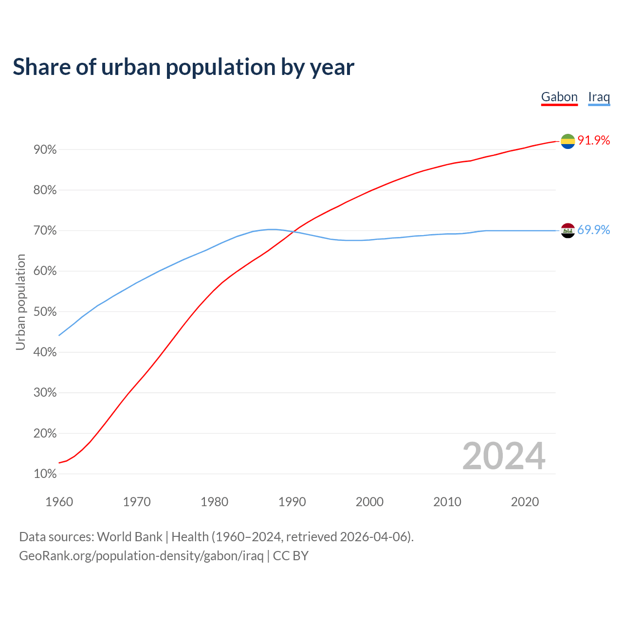 From 2004 to 2024, the share of urban population changed from 82.7% to 91.9% in Gabon and from 68.2% to 69.9% in Iraq.