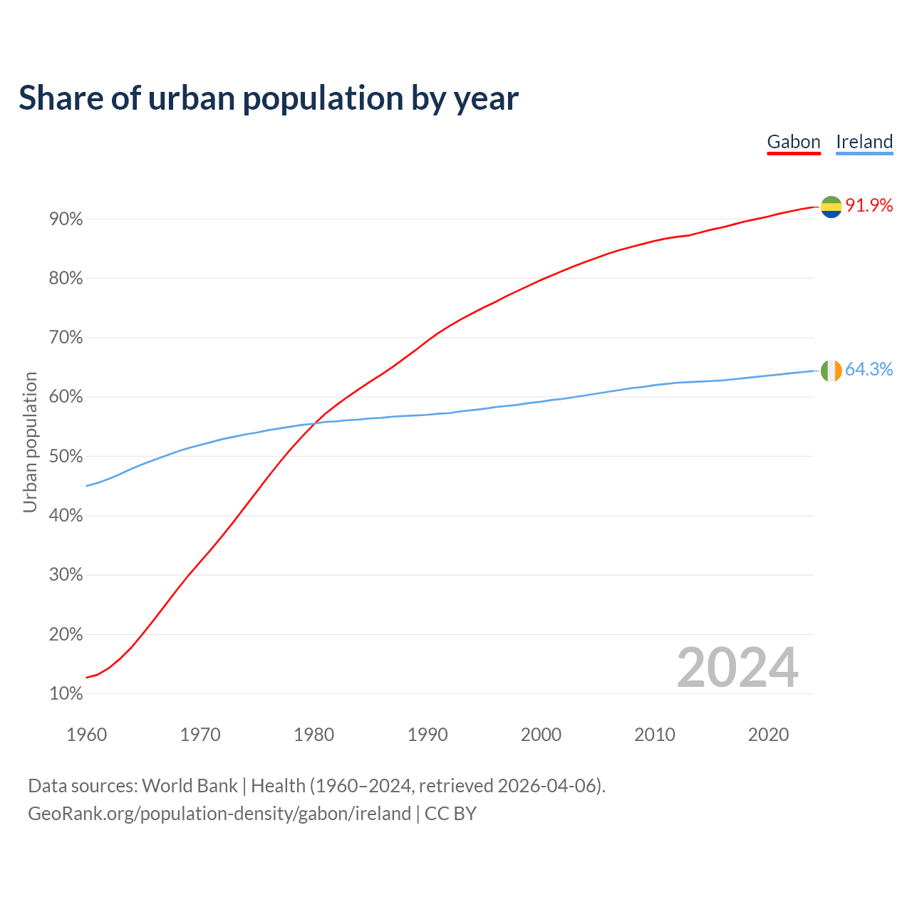 From 2004 to 2024, the share of urban population changed from 82.7% to 91.9% in Gabon and from 60.2% to 64.3% in Ireland.