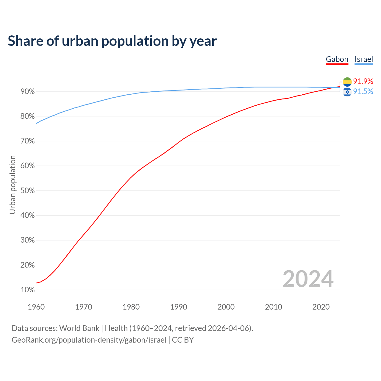 From 2004 to 2024, the share of urban population changed from 82.7% to 91.9% in Gabon and from 91.6% to 91.5% in Israel.