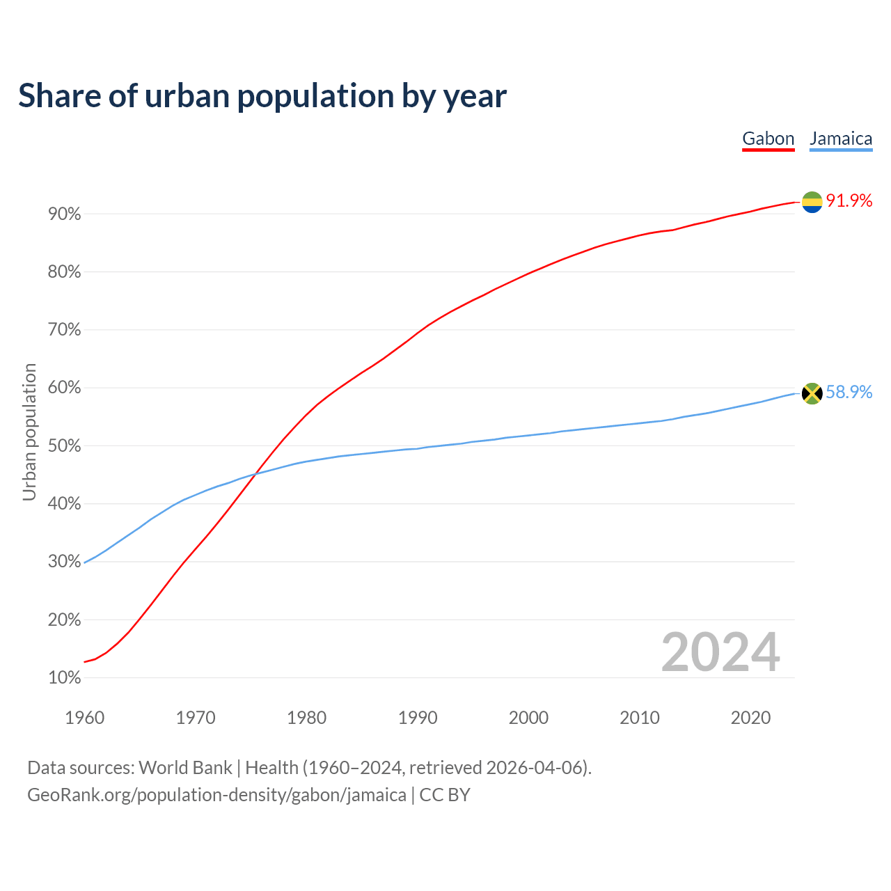 From 2004 to 2024, the share of urban population changed from 82.7% to 91.9% in Gabon and from 52.6% to 58.9% in Jamaica.