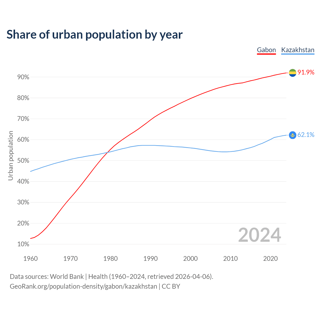 From 2004 to 2024, the share of urban population changed from 82.7% to 91.9% in Gabon and from 54.9% to 62.1% in Kazakhstan.