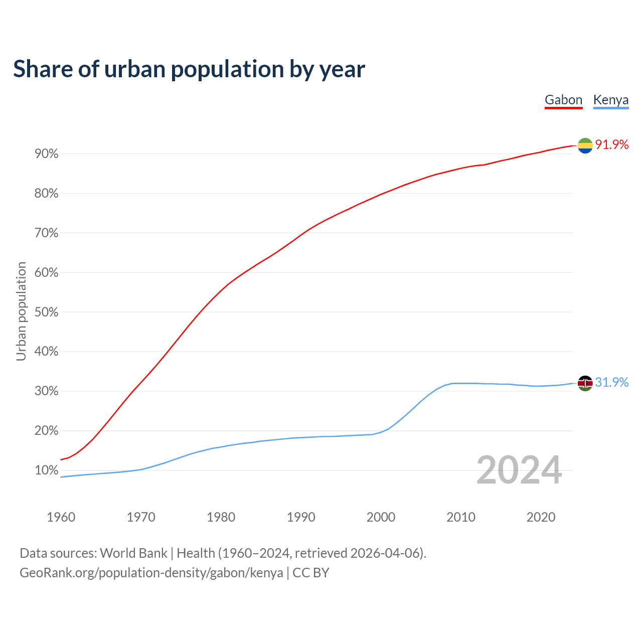 From 2004 to 2024, the share of urban population changed from 82.7% to 91.9% in Gabon and from 25.4% to 31.9% in Kenya.