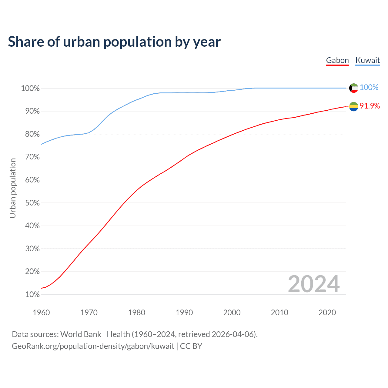From 2004 to 2024, the share of urban population changed from 82.7% to 91.9% in Gabon and from 99.9% to 100% in Kuwait.