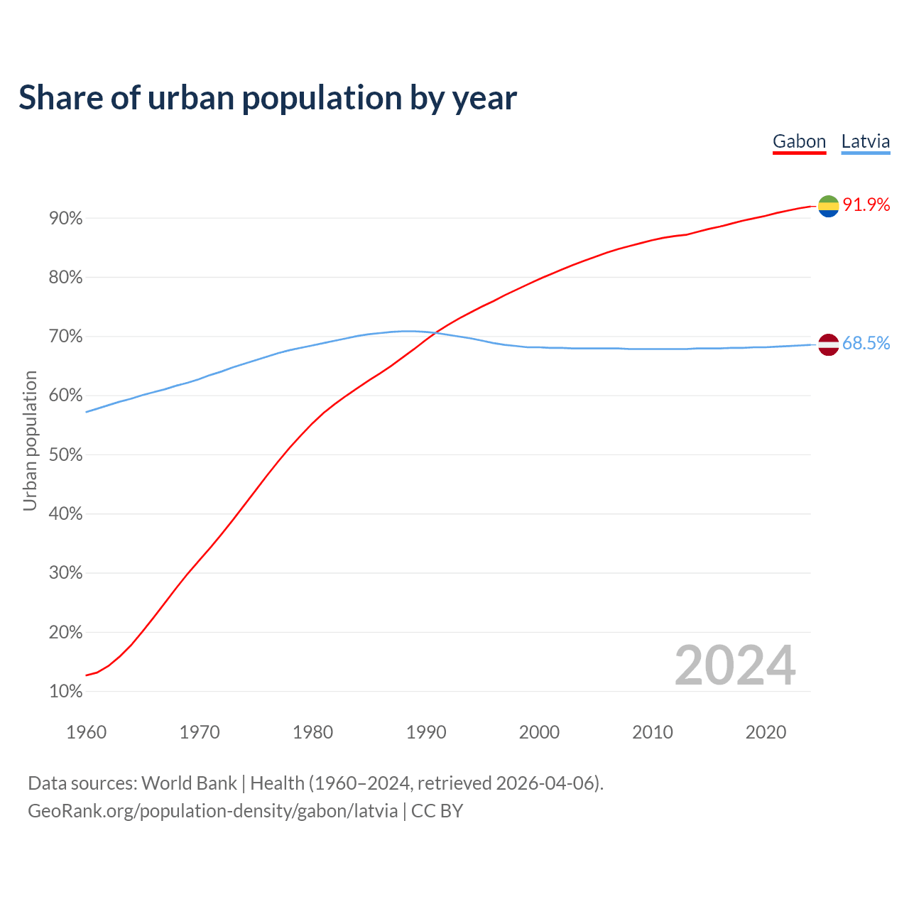 From 2004 to 2024, the share of urban population changed from 82.7% to 91.9% in Gabon and from 67.9% to 68.5% in Latvia.