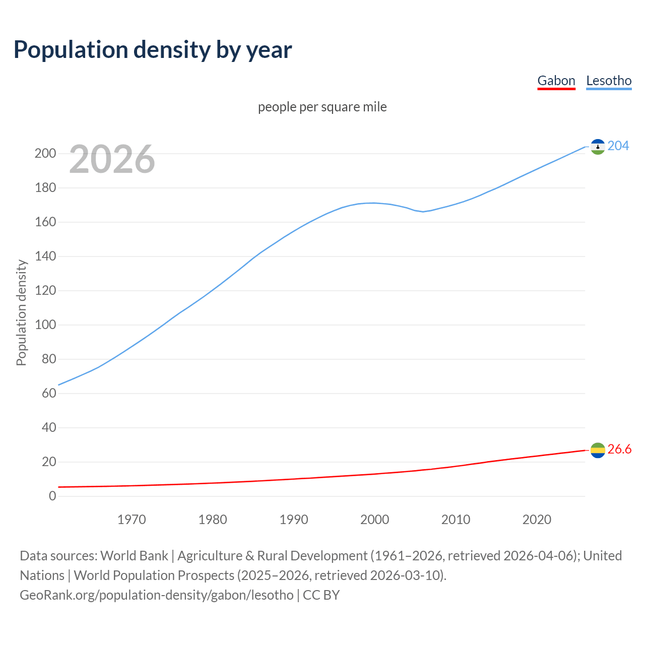 From 2006 to 2026, population density in Gabon increased by 75.6%, compared to a 22.9% growth in Lesotho.