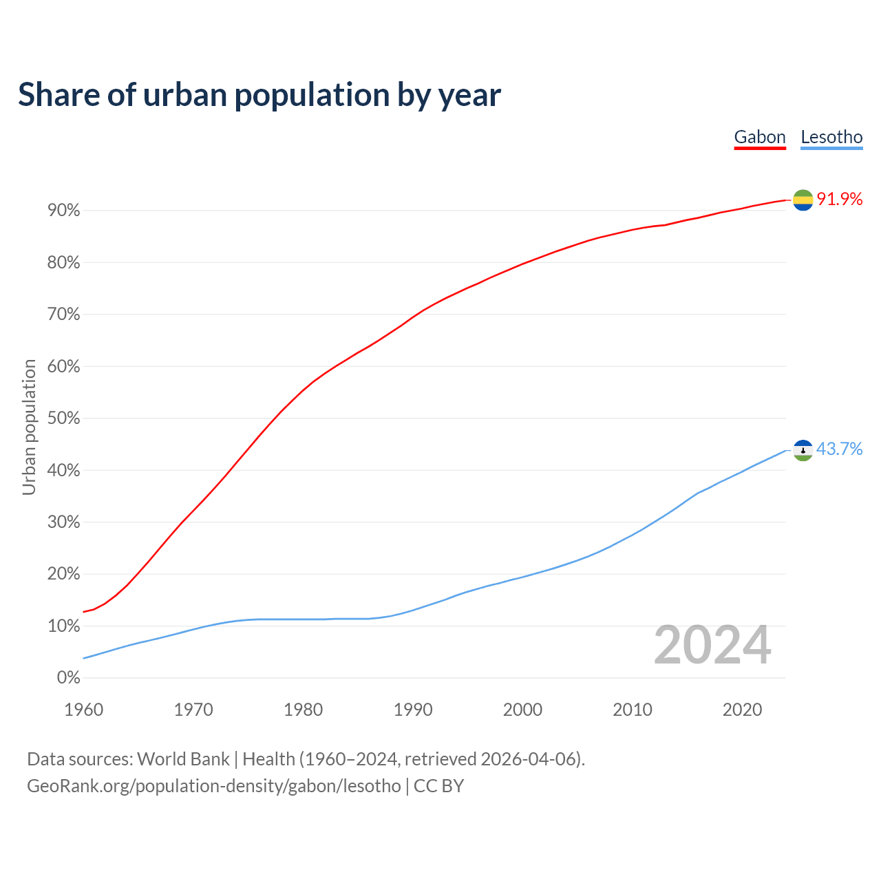 From 2004 to 2024, the share of urban population changed from 82.7% to 91.9% in Gabon and from 21.8% to 43.7% in Lesotho.