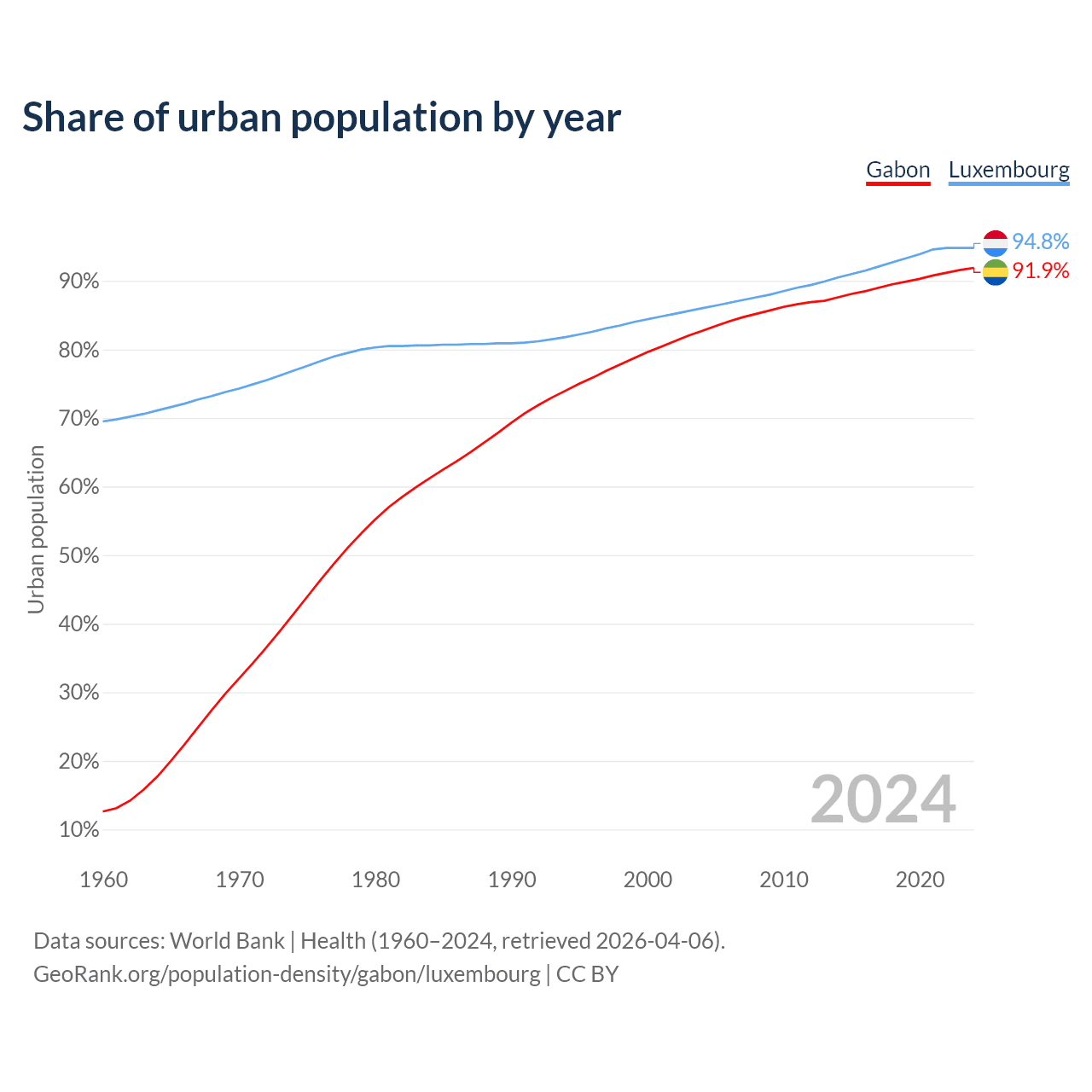 From 2004 to 2024, the share of urban population changed from 82.7% to 91.9% in Gabon and from 86% to 94.8% in Luxembourg.