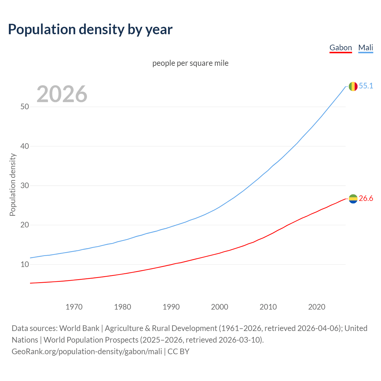 From 2006 to 2026, population density in Gabon increased by 75.6%, compared to a 85.4% growth in Mali.