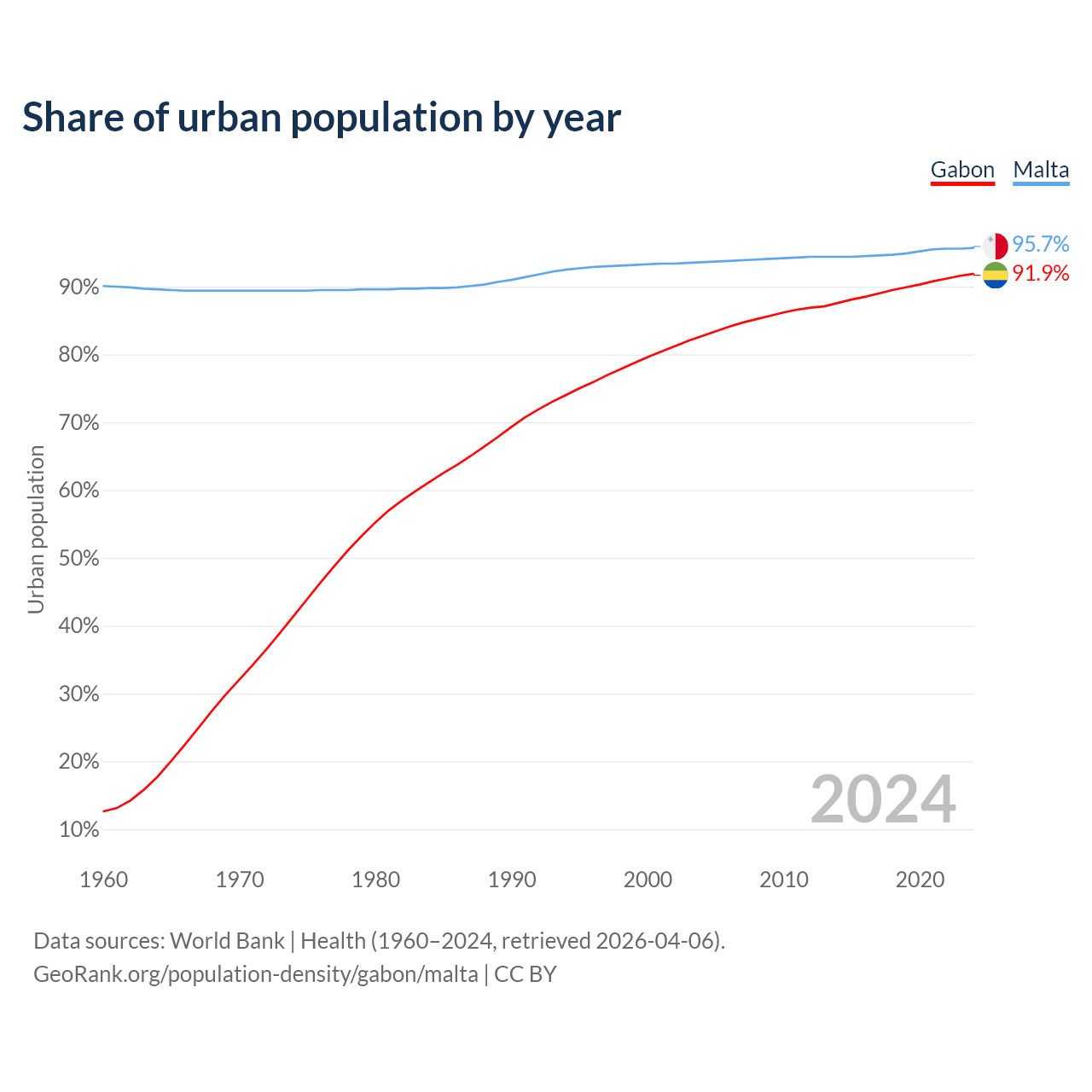 From 2004 to 2024, the share of urban population changed from 82.7% to 91.9% in Gabon and from 93.6% to 95.7% in Malta.