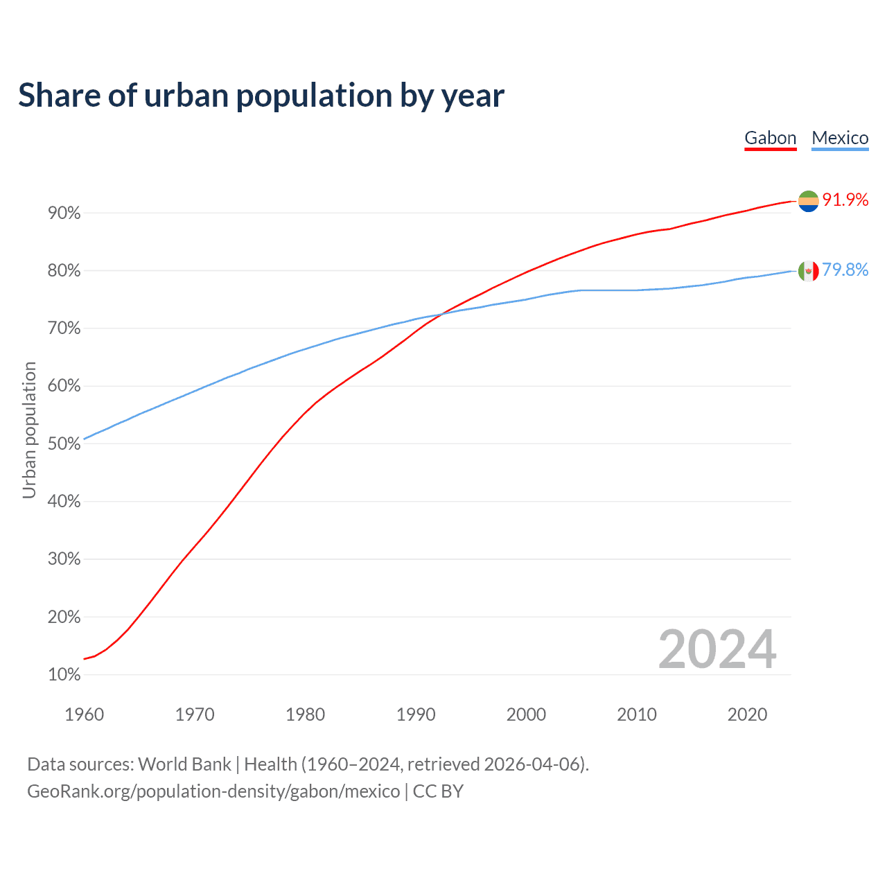 From 2004 to 2024, the share of urban population changed from 82.7% to 91.9% in Gabon and from 76.3% to 79.8% in Mexico.