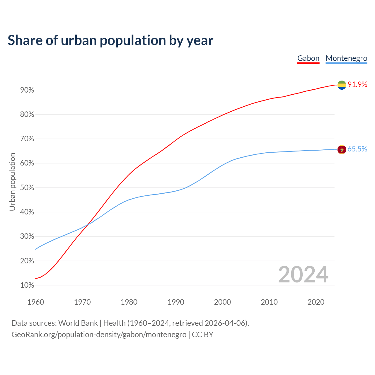 From 2004 to 2024, the share of urban population changed from 82.7% to 91.9% in Gabon and from 62.2% to 65.5% in Montenegro.