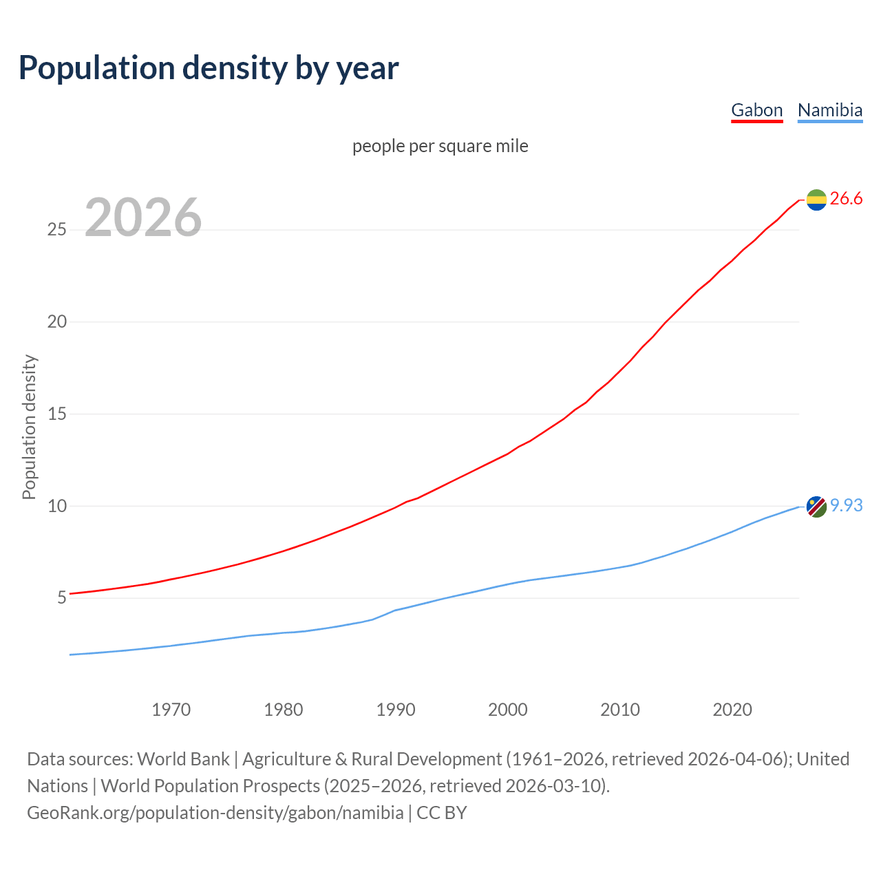 From 2006 to 2026, population density in Gabon increased by 75.6%, compared to a 58.5% growth in Namibia.