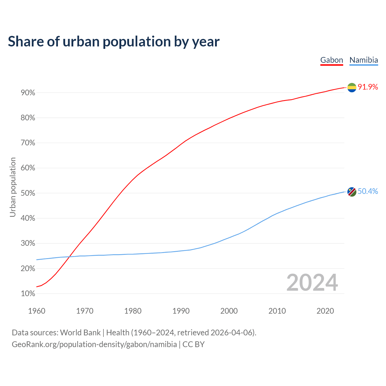 From 2004 to 2024, the share of urban population changed from 82.7% to 91.9% in Gabon and from 35.5% to 50.4% in Namibia.