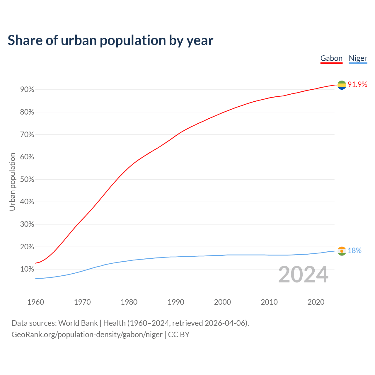 From 2004 to 2024, the share of urban population changed from 82.7% to 91.9% in Gabon and from 16.3% to 18% in Niger.