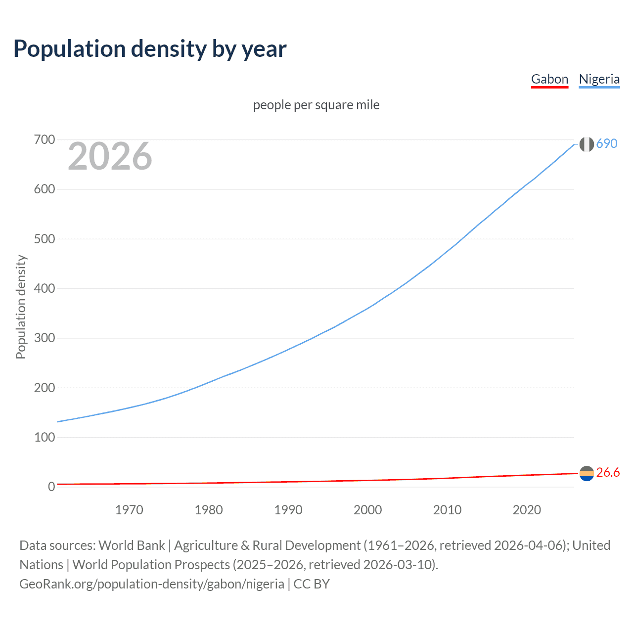 From 2006 to 2026, population density in Gabon increased by 75.6%, compared to a 62.7% growth in Nigeria.
